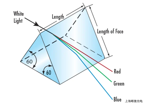 上海晰微光电技术有限公司生产的色散棱镜用于将白光分成可见光谱。色散棱镜一般以最小偏向角使用,在最小偏向角条件下,某一波长的入射光通过棱镜时与底面平行,而且相对于各自界面的棱镜面法线测量时,入射角等于折射角。最小偏向角时,由于入射角接近布鲁斯特角,因此可实现最大的通光孔径,并降低P偏振光的反射损耗。对于S偏振光,可以通过定制增透膜来减少表面反射。