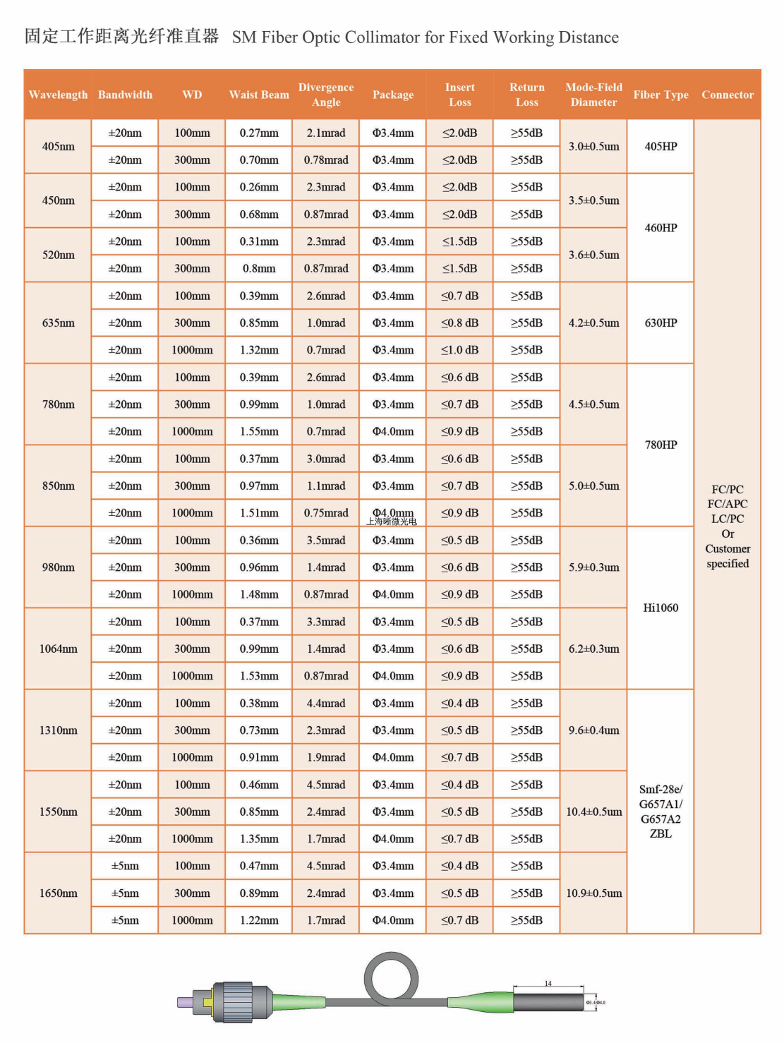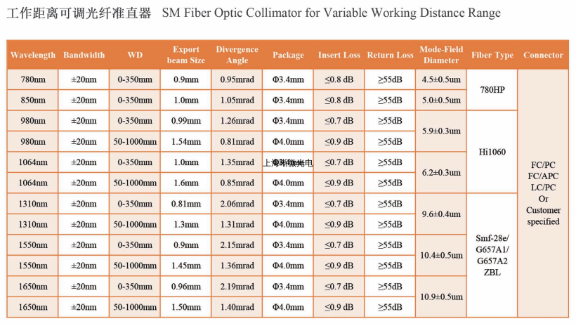 上海晰微光电生产的单模光纤准直器,由光纤尾纤和聚焦透镜精确定位封装而成,可将光纤传输出射光变成平行光束(高斯光束),或将外界的平行光聚焦耦合进入光纤内。亦可以单只使用,按照既定发散角,在特定位置达到要求尺寸的光斑。