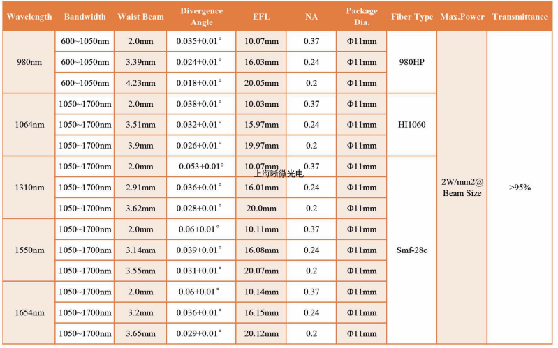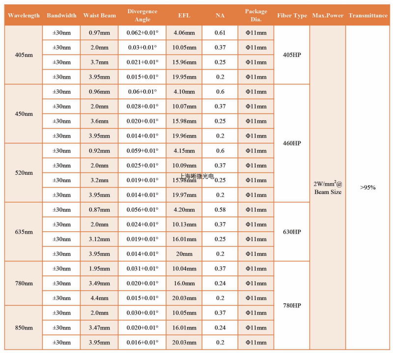 上海晰微光电生产的消色差准直器,由一组长焦准直光学系统构成,有消色差、消像差设计,故准直器焦距对波长带宽不敏感。它将光纤出射的发散光束进行整形处理,使光束在一定距离范围内具备良好的准直效果和光斑形状。透镜组各光学表面镀制增透膜,最大限度减少表面反射。透镜和光纤的相对位置经过精密调试,确保出光偏角在0.3范围以内,同时标准化的制作工艺,确保产品稳定的一致性。