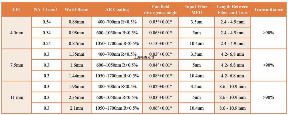 上海晰微光电生产的可调焦非球面准直器,设计在机械件内部用采用弹簧装配适用的光学透镜,用于光纤光束的准直器输出,也可用于空间光耦合进入光纤。通过旋转准直器外部的套管可以使内部的光学透镜延光轴方向进行前后平移,从而调节透镜与光纤端面之间的距离,得到不同光斑尺寸。一旦达到所需位置,就可以将外壳滚花锁紧环将调节器锁定。